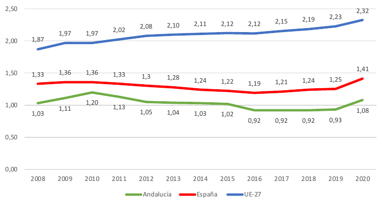 Así, el gasto en I+D supone el 1,08% del PIB regional, aún por debajo del 1,41% nacional y del 2,32% de la UE-27 en 2020, por lo que no se ha logrado alcanzar el 2% fijado como objetivo para España en la Estrategia Europa 2020 y para Andalucía en la Agenda por el Empleo. De hecho, en la Comunidad Autónoma se ha producido un retroceso respecto a 2010 (1,2% entonces), ya que la inversión dedicada a adquirir conocimiento por el conjunto de los sectores económicos en la región no ha recuperado el máximo nivel alcanzado en 2010 (entonces era de 1.726,7 millones de euros, frente a los 1.627,25 millones de euros en 2020).