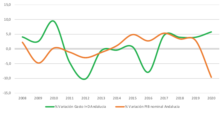 En consecuencia, la brecha negativa para Andalucía se ha acrecentado en el balance de la última década, si bien en el año 2020 se ha observado un positivo incremento del gasto destinado a la I+D, en términos corrientes, un 5,8%, pese a la fuerte caída de la producción derivada por la crisis de la Covid-19, con un descenso del PIB nominal cercano al 10%.