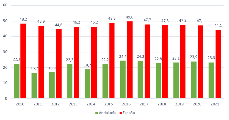 Por otro lado, el sector industrial en Andalucía se caracteriza por un menor peso de la actividad manufacturera, mientras que las actividades no manufactureras (energía, agua, saneamiento, gestión de residuos, descontaminación, entre otras) presentan un mayor peso relativo dentro de la industria, superior al del promedio de España (34,6% frente al 26%, respectivamente, en 2021).