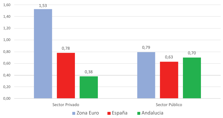 Este es un elemento diferencial respecto al entorno europeo. Así, en Andalucía, el sector público realizó en 2020 casi las dos terceras partes (65%) del gasto en I+D, correspondiendo el 35% al sector empresarial. Mientras, en la UE, se observa lo contrario, es decir, la mayor proporción del gasto en I+D lo realiza el sector privado (65,8% del total) y tan solo la tercera parte restante el sector público.