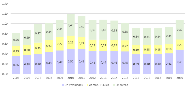 Otro rasgo destacable se refiere a la desequilibrada distribución del gasto en I+D entre los sectores institucionales, debido a la menor implicación o participación del sector empresarial en su grado de ejecución sobre el gasto total en I+D y en su financiación.