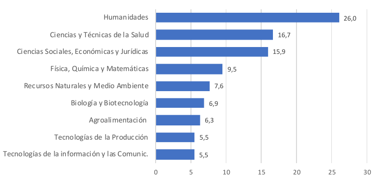 Fuente: Dirección General de Investigación y Transferencia del Conocimiento - Sistema de Información Científica de Andalucía. Unidad: En % sobre el total. Nota: Datos de 2019.