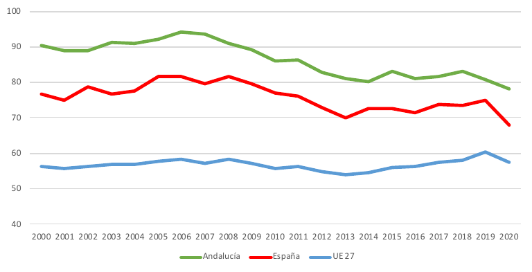 Una forma de evaluar a lo largo del tiempo la solidez del sistema energético en un espacio económico resulta de analizar la trayectoria de la tasa de dependencia energética, tasa que en Andalucía ha venido mostrando un progresivo y favorable perfil descendente desde hace una década. Sin embargo, aunque se han acortado las distancias con respecto a los promedios nacional y europeo, lo cierto es que la brecha persiste y que el grado de dependencia energética exterior es mayor en Andalucía (78,2 % en 2020) que en España y en el conjunto de la UE-27 (67,9% y 57,5%, respectivamente), lo que hace más vulnerable a la economía regional.