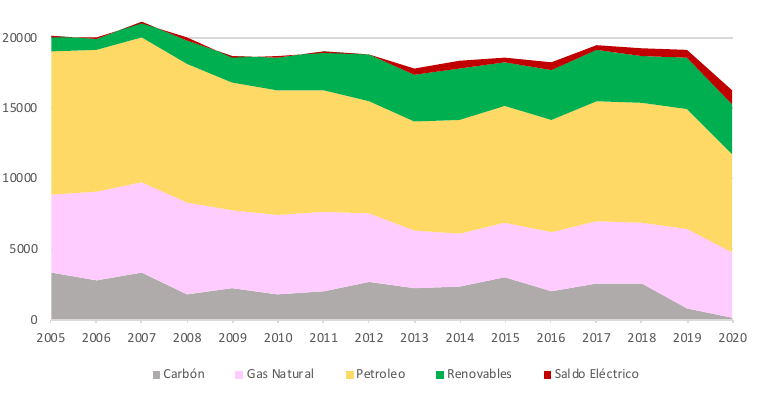 Evolución del consumo de energía primaria por fuentes en Andalucía (ktep).