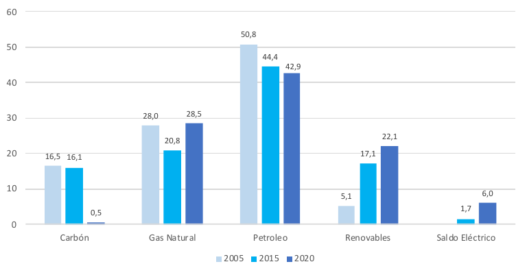 Las energías renovables han ido ganando protagonismo en la matriz de demanda de energía de Andalucía, pasando de suponer un 5% del consumo primario de energía, excluyendo usos no energéticos en 2006 (año de menor aporte renovable) al 21% en 2019. Además, se ha reducido de forma drástica la demanda de carbón, suponiendo solo el 3,9% del total del consumo energético de la comunidad.