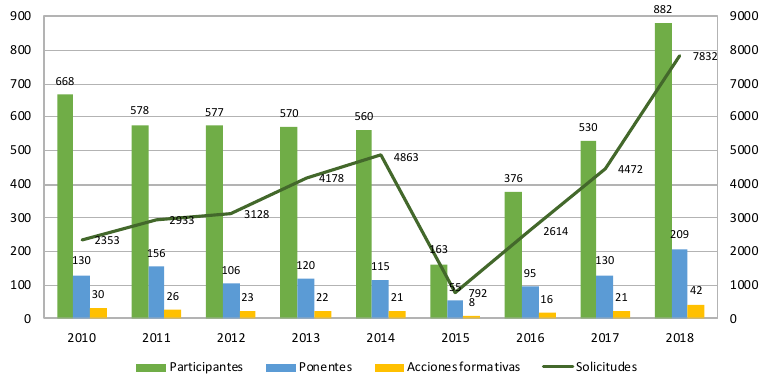 La evolución del Plan Andaluz de Formación Ambiental es positiva, con un importante número de acciones y participantes en 2018, si bien debe seguir aumentando en ejercicios futuros.
