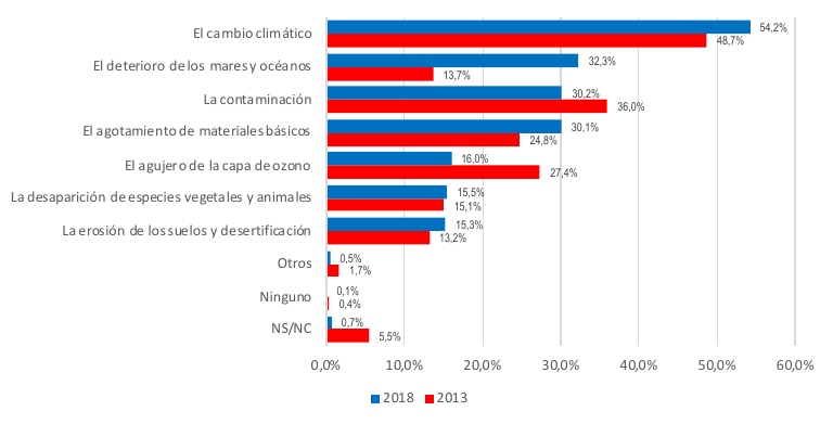 Fuente: Ecobarómetro de Andalucía. 2018. Consejería de Agricultura, Ganadería, Pesca y Desarrollo Sostenible. Nota: Elaboración propia, a partir de la pregunta n.º 24 del cuestionario EBA 2018: Del siguiente listado de problemas ambientales de carácter general, es decir, que afectan a todo el planeta. Por favor dígame los dos que, en su opinión, tienen más importancia.
