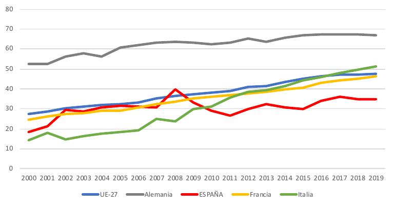 Tasa de reciclaje de residuos municipales: España vs. paises de referencia UE (%)