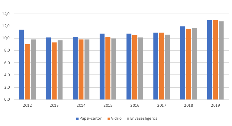 El volumen (kg/habitante) de la recogida selectiva y reciclaje de papel-cartón, envases ligeros y vidrio en Andalucía ha venido registrando en los últimos años un crecimiento modesto, si bien en 2019 (último año del que se dispone información) ha experimentado un positivo ascenso. Si bien se ha avanzado mucho en cuanto al reciclado de envases ligeros, en el caso de los envases de vidrio, la cuota de reciclaje sobre el total de recogidos queda todavía muy lejos del objetivo fijado del 75% para 2030, por la Directiva de envases (Directiva (UE) 2018/852 del Parlamento Europeo y del Consejo, de 30 de mayo de 2018).