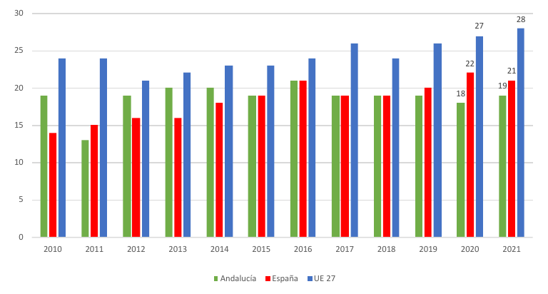 De acuerdo a estos indicadores y a otras dimensiones basadas en el Índice de la Sociedad y Economía Digital definido por la Comisión Europea (DESI, Digital Economy and Society Index), el grado de madurez digital de las empresas andaluzas es relativamente bajo, especialmente en el caso de las empresas más pequeñas (menos de 10 personas empleadas). Así se refleja en la dimensión de “integración de la tecnología digital” del DESI que mide el grado de digitalización de las empresas y su incorporación al comercio electrónico. Este índice muestra una posición ligeramente más atrasada de Andalucía respecto al conjunto de España, así como respecto a Europa.