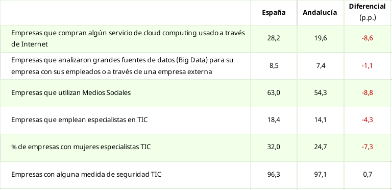 Atendiendo a los distintos componentes o ejes del grado de digitalización de las empresas, existe un amplio margen de mejora en la implantación del Big Data, el uso del Cloud, así como en la incorporación de personal especializado en TIC, siendo además los resultados de estos indicadores para Andalucía inferiores a los del promedio de las empresas en España. Los resultados son algo menos negativos en lo que se refiere al comercio electrónico y al uso de sistemas y herramientas de seguridad.