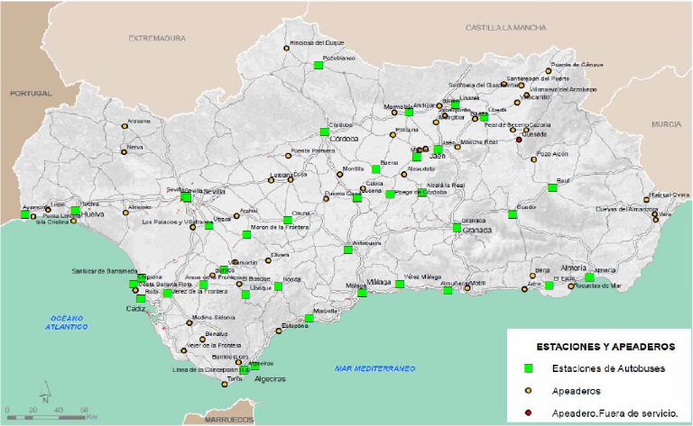 Estas carreteras dan soporte al transporte público de personas, registrándose 62,1 millones de viajeros en transporte público interurbano en 2019, con una ocupación media de 17,20 viajeros/vehículo. Este elevado volumen de utilización, aunque es inferior al del año 2000 (82,3 millones de viajeros), hace necesario una dotación adecuada de sus instalaciones para poder dar un servicio que cubra a toda la región. En Andalucía aún existen zonas donde el transporte interurbano por autobús carece de infraestructuras básicas, como son las estaciones o los apeaderos. Actualmente, nuestra región está compuesta por una red de 52 apeaderos y 45 estaciones, lo que supone una cobertura en Andalucía de más de 4,6 millones de habitantes (54,9% del total de la población andaluza). Hay que seguir impulsando la mejora y ampliación de la dotación de estaciones y apeaderos en la región, estudiando el déficit que pueda existir en determinados ámbitos y ligado a las necesidades de nuevas líneas de transporte de autobuses interurbanos.