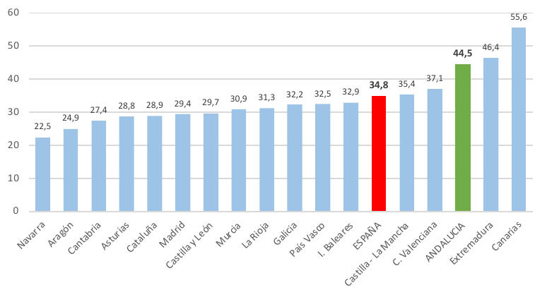 Andalucía registra una de las tasas más alta de desempleo juvenil de todo el Estado, alcanzando el 44,5% de la población andaluza menor de 25 años en 2021, solo superada por Canarias y Extremadura, por encima a la media estatal (34,8%) en casi 10 puntos, a pesar de que este diferencial ha mostrado un positivo descenso en 2021.