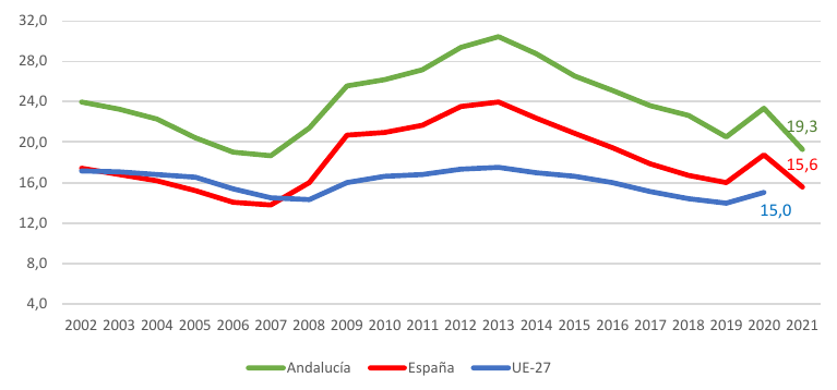 Además, preocupa también la elevada proporción de jóvenes entre 18 y 24 años que están situación de desempleo y que ni estudian ni reciben formación (19,3% en 2021) en Andalucía, una proporción superior a la media española (15,6%) y a la de la UE (15%, en este caso con datos para 2020). Este indicador de problemas en la transición de la vida educativa a la vida laboral ha mostrado una positiva flexión a la baja en los últimos años, que se ha intensificado en 2021, después del repunte observado en 2020, posiblemente debido al efecto de la pandemia.