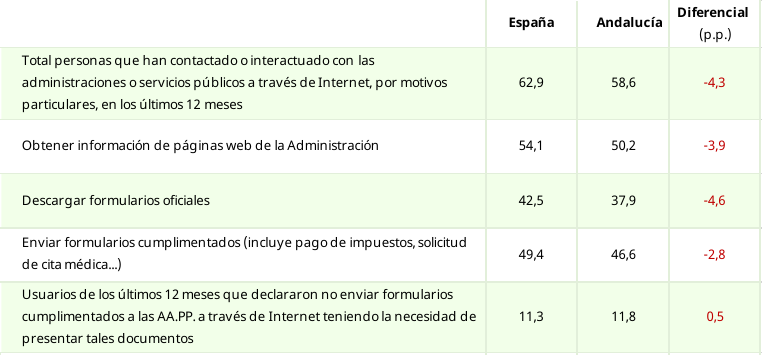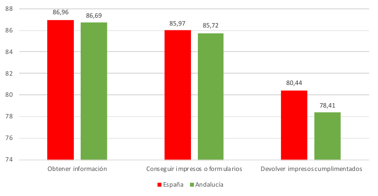 Andalucía obtiene resultados muy similares a los del promedio nacional, si bien algo por debajo en los principales aspectos considerados por las Encuestas sobre el uso de las TIC. Así, el porcentaje de personas que habían contactado o interactuado con las administraciones o servicios públicos a través de Internet en los 12 meses anteriores en 2020 habría ascendido al 58,6%, frente al 62,9% en el promedio de España, en ese mismo año.