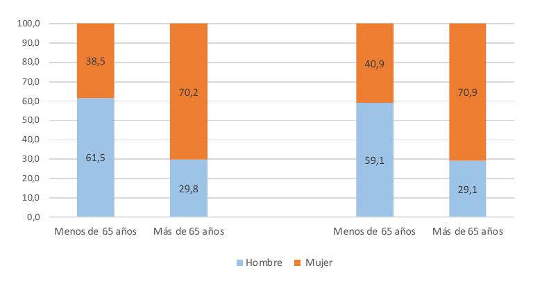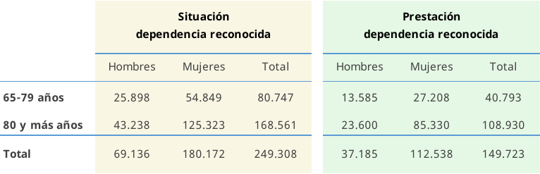 Con datos de julio de 2020, en Andalucía se registraban 289.523 solicitudes de reconocimiento de la situación de dependencia de personas de 65 y más años, de las cuales corresponden el 70,8% a mujeres y el resto a hombres. De ellas, 249.308 tienen reconocida la situación de dependencia, es decir, el 17% de las personas andaluzas mayores de 65 años, de las cuales el 72% son mujeres.