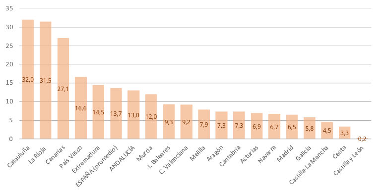 Fuente: IMSERSO. Nota: Porcentaje de personas pendientes de recibir prestación en relación al número total de personas beneficiarias con derecho a prestación, en cada Comunidad Autónoma, según el Sistema para la Autonomía y Atención a la Dependencia (SAAD). A 31 de diciembre de 2021.