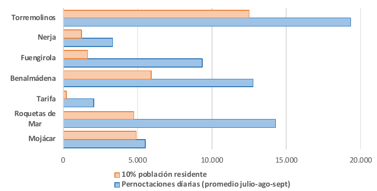 Fuente: Elaboración propia a partir de datos del INE e IECA. Unidad: Promedio de los meses del tercer trimestre de los años 2017, 2018 y 2019. Nota: La comparación de la población residente con las pernoctaciones hoteleras es un modo de aproximar las "personas equivalentes a tiempo completo anual", como medida para estimar la población usuaria de servicios en un territorio.