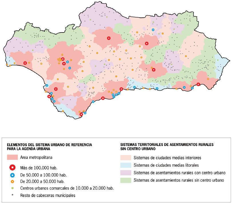 El sistema urbano andaluz está configurado por 10 áreas metropolitanas (Almería-El Ejido, Bahía de Algeciras, Bahía de Cádiz-Jerez, Córdoba, Granada, Huelva, Jaén, Málaga, Costa del Sol y Sevilla), que representan 195 municipios y 68,7% de la población andaluza, las ciudades medias interiores y litorales (253 municipios, 22,3% de la población) y asentamientos rurales con o sin centro urbano (330 municipios, 8,9% de la población).