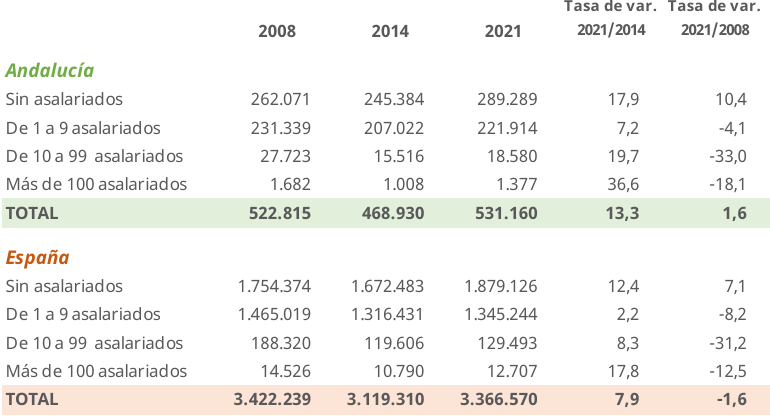 Por otra parte, conviene tener presente que la proporción de empresas que no tienen ningún asalariado (sin empleo, salvo el empresario autónomo) resulta muy elevada, si bien ligeramente por debajo del promedio español. Así, en Andalucía el número de empresas sin asalariados ascendía a 289.289, en 2021, un 54,5% del total (531.160 empresas), registrándose un crecimiento acumulado desde 2014 del 17,9%. En España esta proporción es del 56,2%.