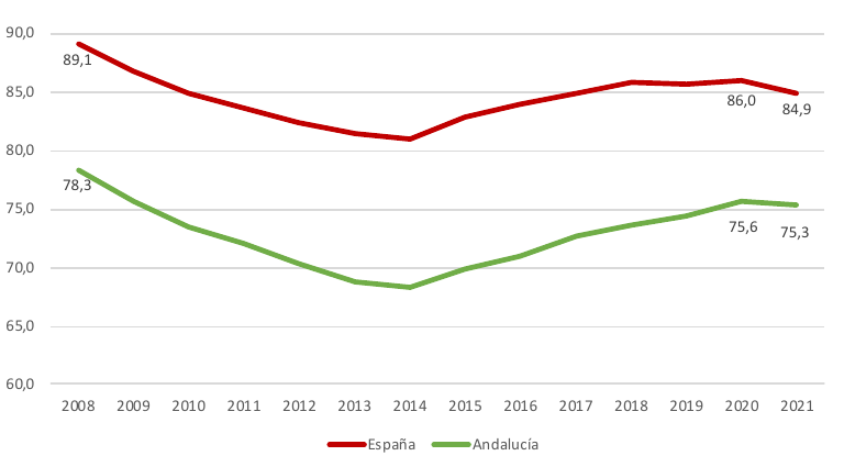 El tejido empresarial de Andalucía es menos compacto o tupido que el del conjunto de España. Dicho de otro modo, el número de empresas en relación a la población resulta más reducida en Andalucía que en los promedios nacional y europeo. Esta ratio de densidad empresarial descendió como consecuencia de la desaparición de empresas durante la anterior crisis y de hecho aún no ha alcanzado los niveles máximos existentes en 2008, ni en Andalucía (75 empresas por cada 1.000 personas en edad de trabajar, en 2021, frente a las 78 que se tenían en 2008), ni en España (86 empresas por cada millar de población económicamente activa, frente a 89 en 2008).