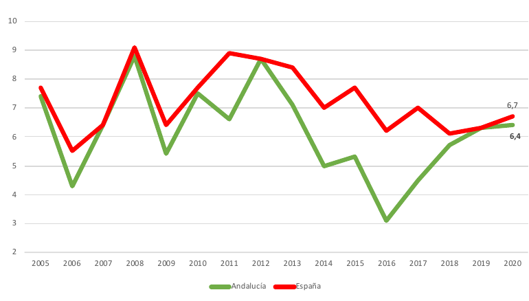 Los resultados de los informes GEM para Andalucía revelan que, en los últimos años, el potencial emprendedor, así como la actividad emprendedora, medida por la Total Entrepreneurial Activity (TEA) no presenta diferencias significativas con respecto al promedio nacional, ya que la tendencia ha sido positiva desde la salida de la anterior crisis, aunque con altibajos. No obstante, de acuerdo a los datos correspondientes al informe 2020/2021, dicha TEA se sitúa en Andalucía (4,9%) algo por debajo de España (5,8%) y de otras regiones como Cataluña (6,6 %) o la Comunidad de Madrid (con una TAE cercana al 6%), y países de nuestro entorno, como Reino Unido, donde ronda el 8%.