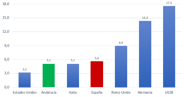 Así, en el porcentaje de emprendedores que exporta más del 25 % de sus ventas se sitúa en Andalucía en el 5,1 %, (5,6% en España) alejado de la media de la UE (17,5 %), Alemania (14,3%%) y Reino Unido (8,9%).